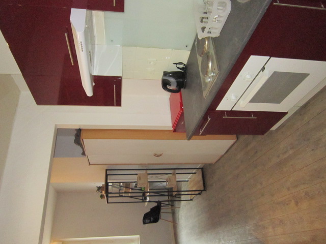 Réfrigérateur, plaques de cuisson, hotte, four, vaisselle, rangements, table et chaise haute