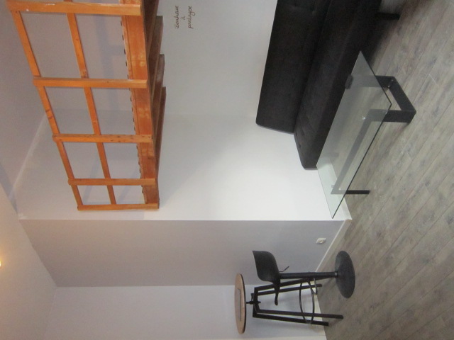Lit double en mezzanine, canapé/lit, table basse, bureau