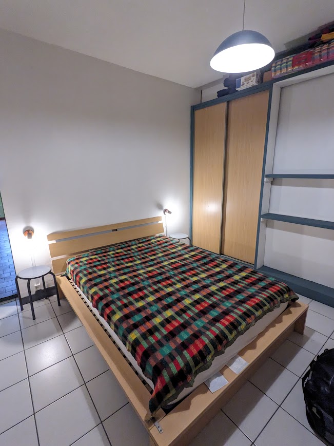 Lit double avec linge de lit, armoires, canapé, table basse, table et chaise, lave-linge...