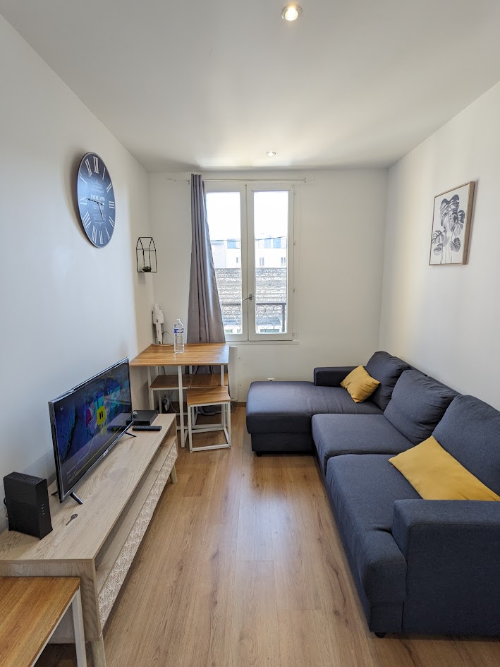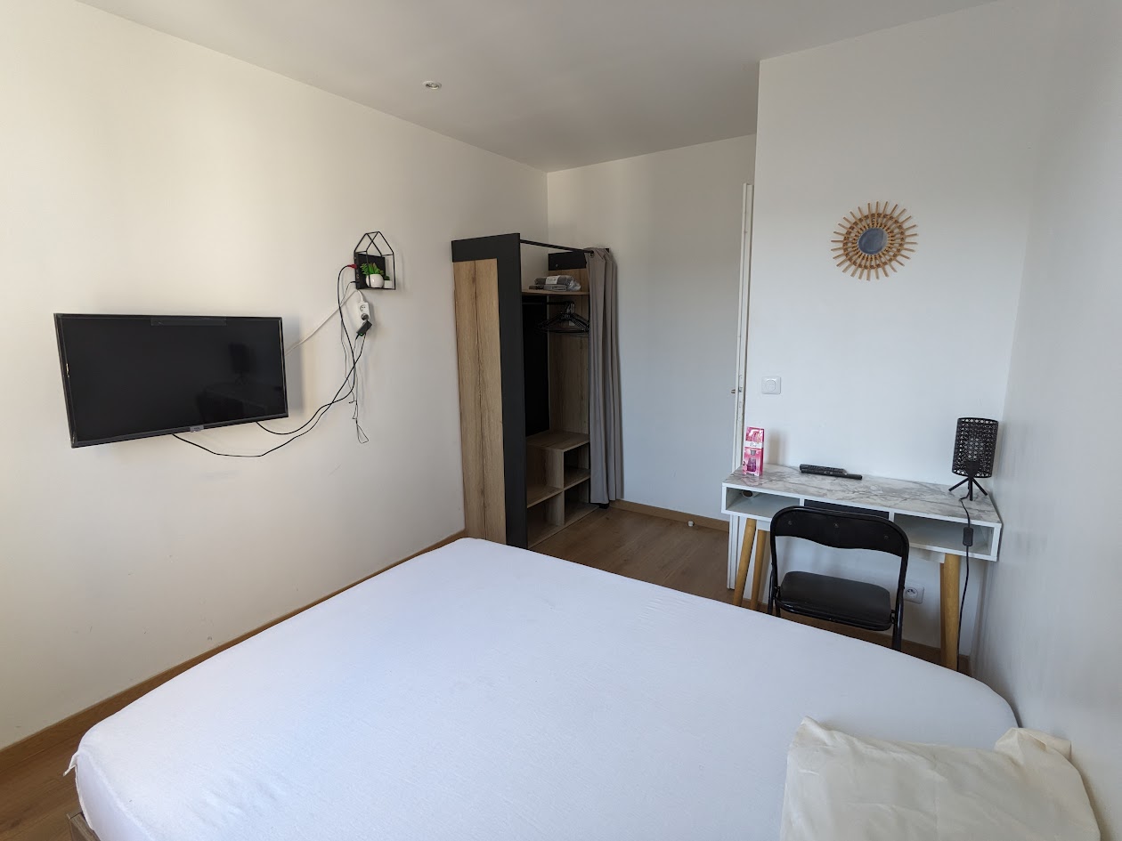 Équipements Salon commun avec canapé, table, et TV. Chambre avec lit double, bureau, armoire/penderie, TV, oreillers et draps (sauf couette)