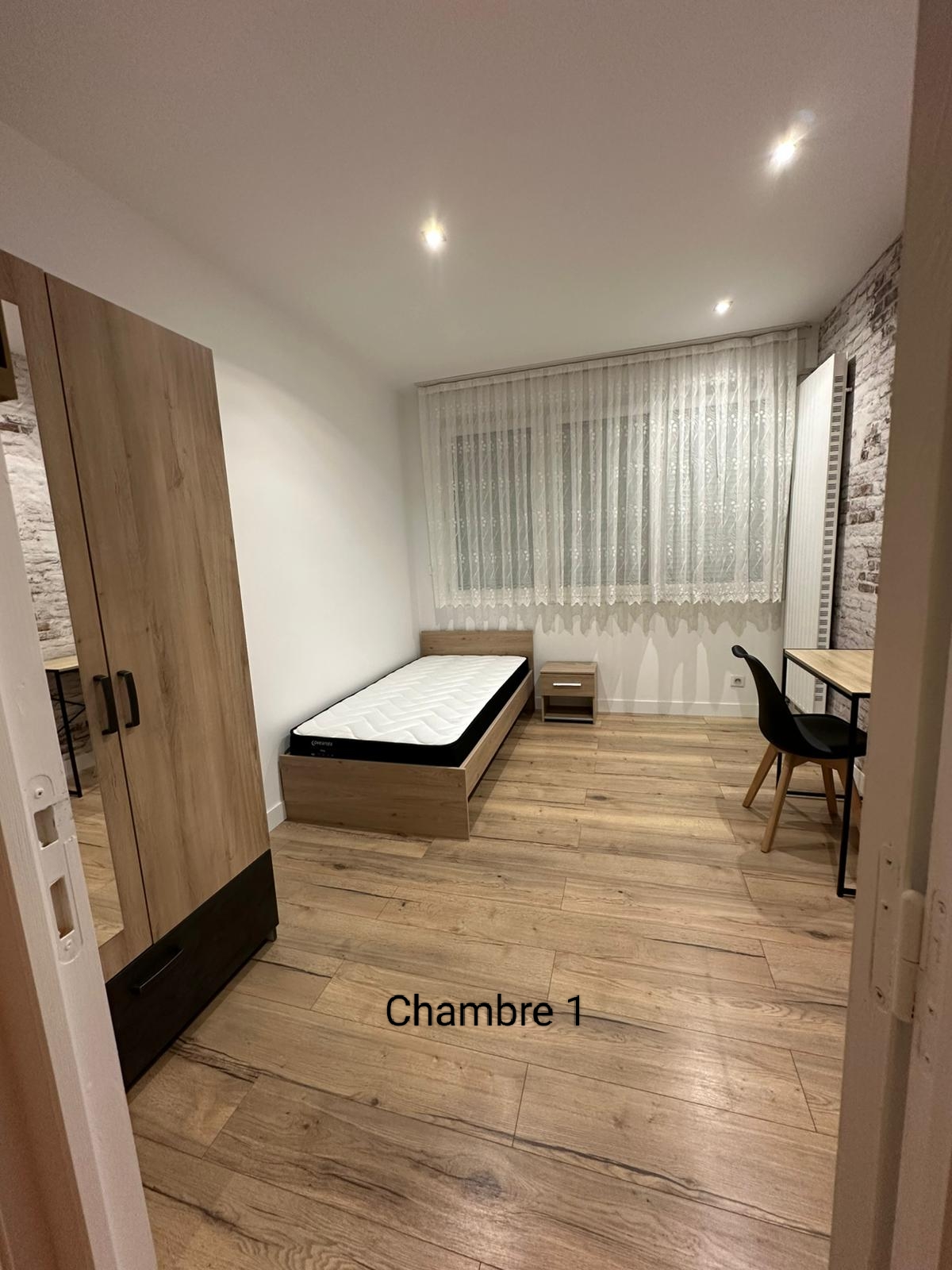 Chambre 1 en colocation avec 6 autres étudiants dans une grande maison de 147m2 entièrement rénovée. Buanderie avec 2 lave-linge et sèche linge. Grande cuisine commune et jardin sécurisé avec caméras. Le ménage des parties communes 2 fois par mois est inclus ainsi que le wifi fibre.